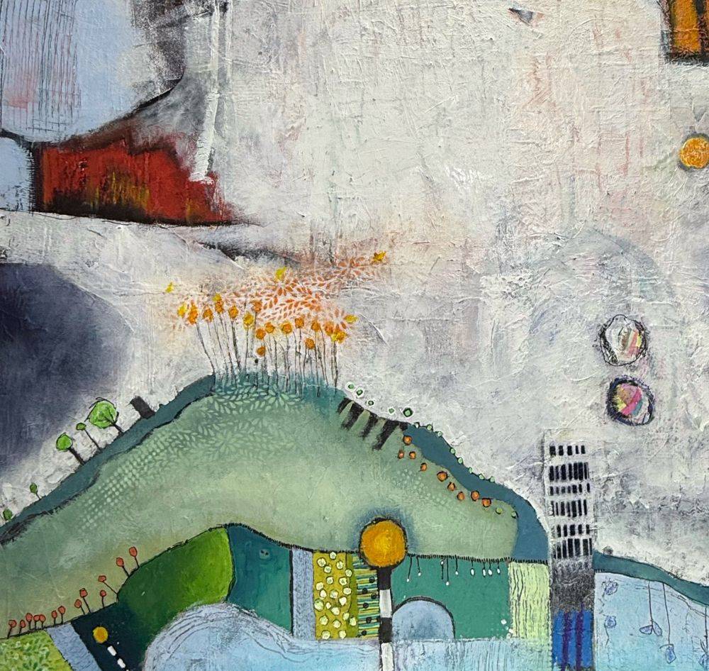 Chameleon #2 continues the visual language I’ve been developing: that playful collision of structure and looseness where geometric fragments, half-formed shapes and little botanical murmurs all jostle their way across the surface. There’s a sort of “urban engineering meets soft ecosystem” energy throughout. Firm lines suddenly evaporate, while lilacs and pinks push into something atmospheric. Along the lower edge, tiny rhythmic marks from collaged sketchbook pages hint at wetlands, pathways, planting schemes or even a hesitant skyline.