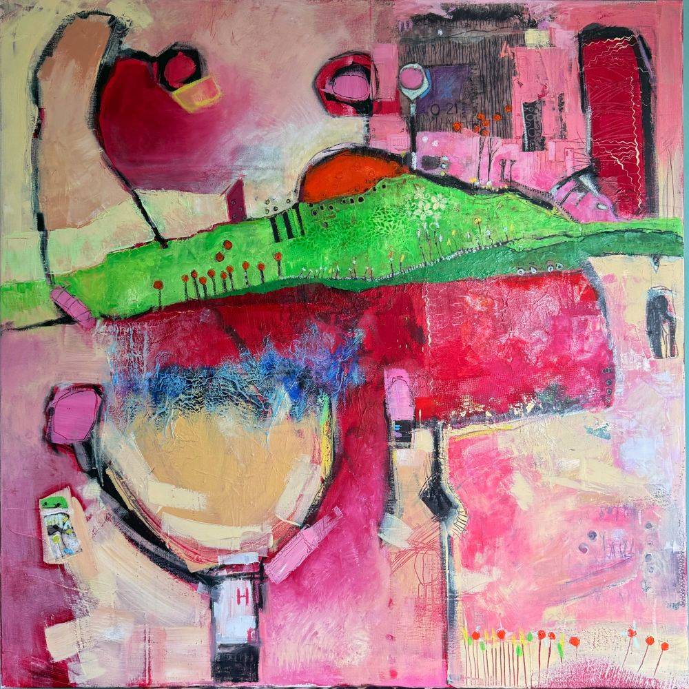 What interested me most here was how colour and shape could carry the weight instead. I worked instinctively, letting blocks of pink, green and red push against one another, building a sense of movement and balance without needing to explain themselves. Marks overlap, edges soften and meanings drift. Any sense of land versus development is now only a faint echo, not a message but a memory.