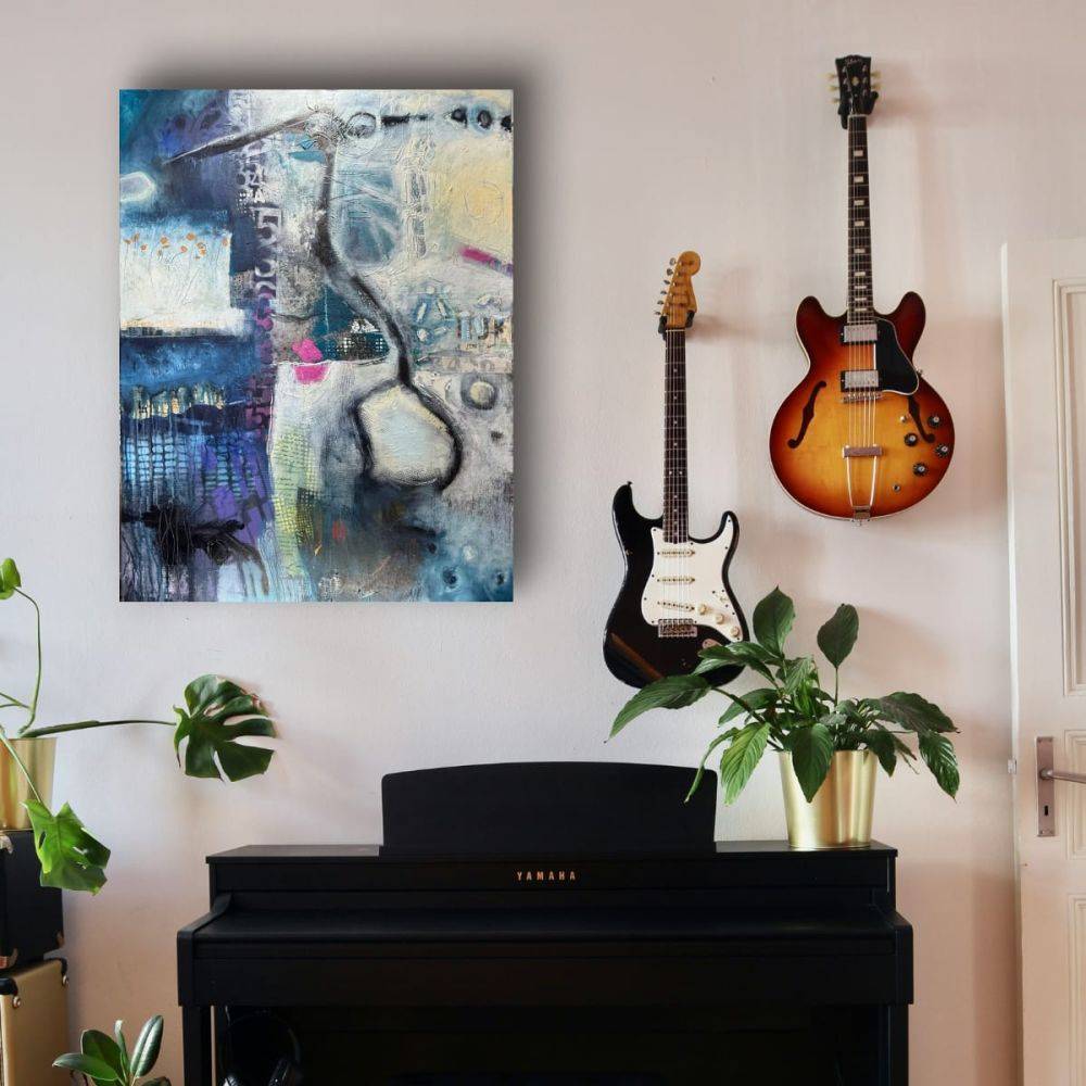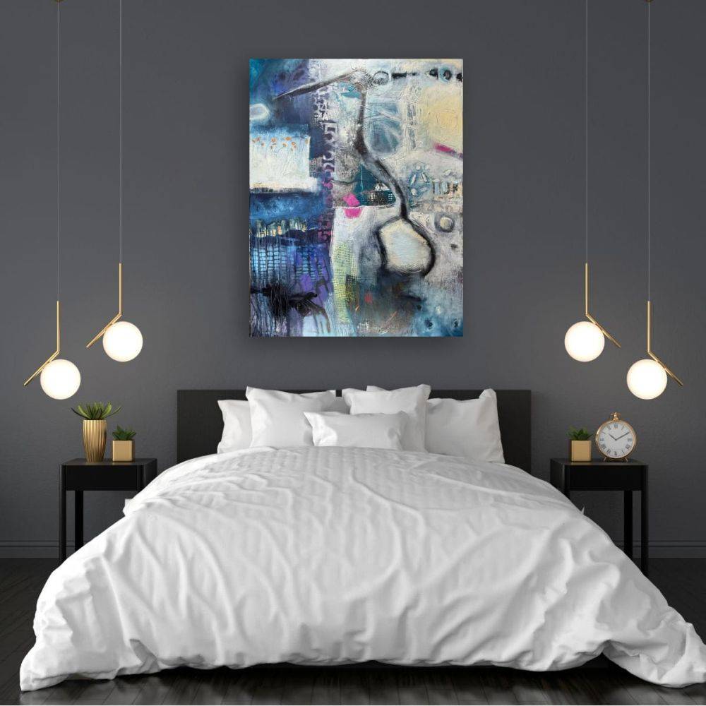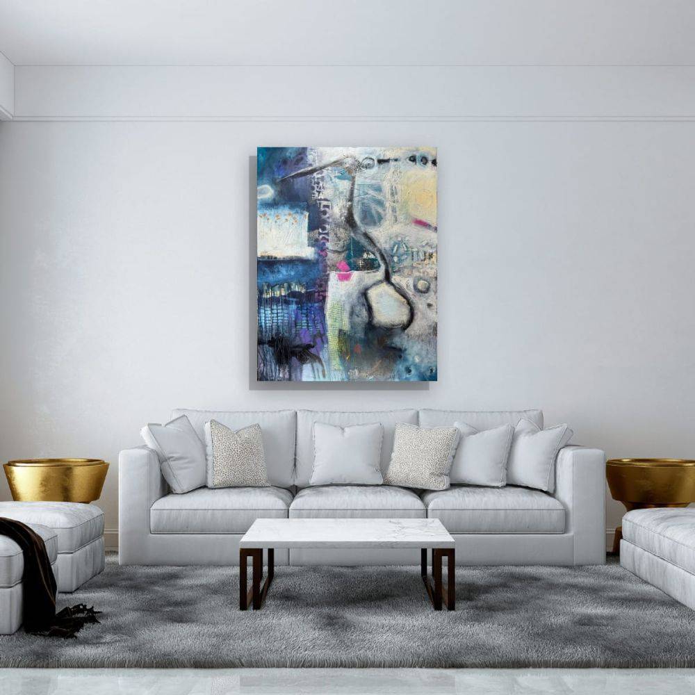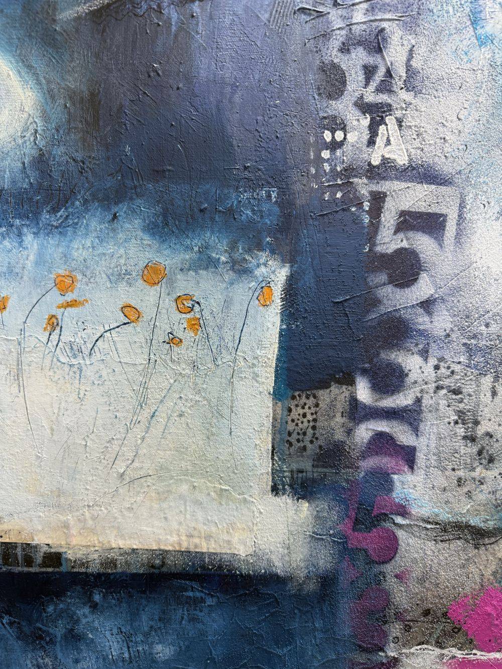 Softly fractured planes of colour merge and drift across the surface, intersected by fluid, almost anatomical lines that suggest movement, memory and internal landscapes rather than external places. Strong traces of stencilled mark-making and collaged texture emerge, scraped back from below and then recede, creating a sense of transition and release. The composition feels both grounded like a new start, as though something familiar is being gently loosened for the next stage.