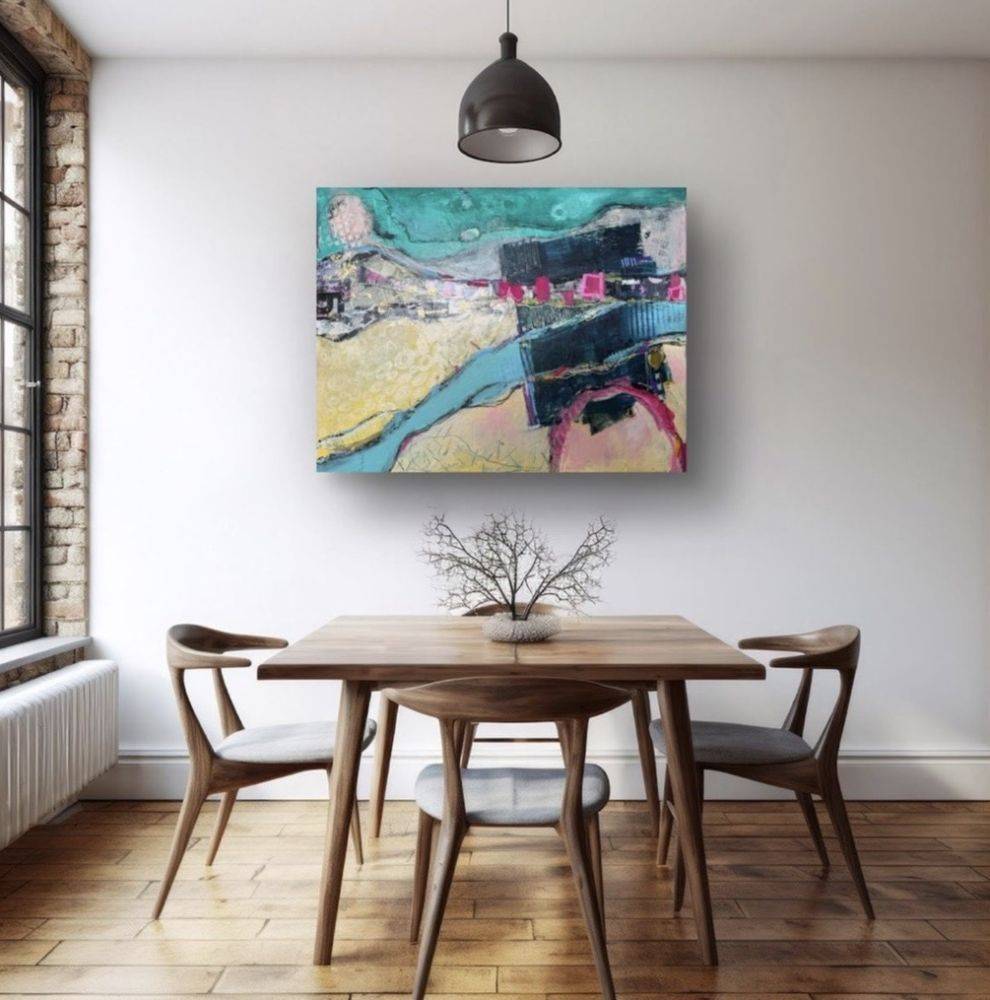 Aer #2/5 (2026), the second work in this limited edition of five paintings, again using collage, acrylic and mixed media explores the marks left as the earth grows and evolves leaving forms and fissures engulfing man made objects whilst man makes objects to work alongside the evolution - roads, railways, canals and settlements.