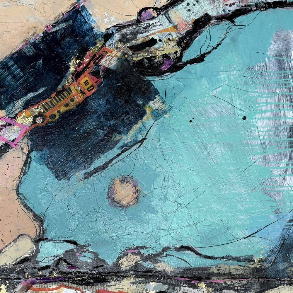 Aer #3/6 (2026), the third piece in this limited edition of six paintings, again using collage, acrylic and mixed media explores the marks left as the earth grows and evolves leaving forms and fissures engulfing man made objects whilst man make objects to work alongside the evolution - roads, railways, canals and settlements.