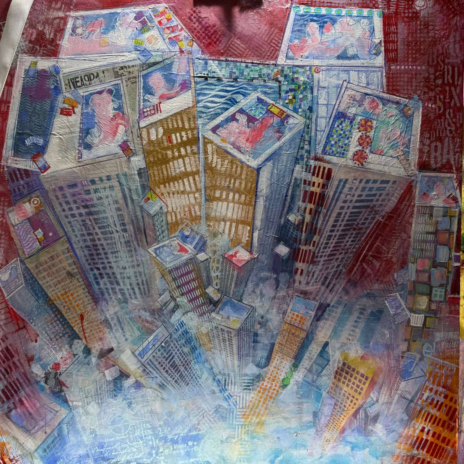I wanted to capture that surreal, almost absurd view of cities that grow taller while empathy sinks lower. Skyscrapers with Swimming Pools is a vivid mixed-media cityscape, painted like an aerial dream - patterned towers rising through a foreboding red sky. It’s about privilege, imbalance, and the strange beauty of modern life. For me, the city here feels alive but indifferent - a vertical maze of ambition and isolation.
