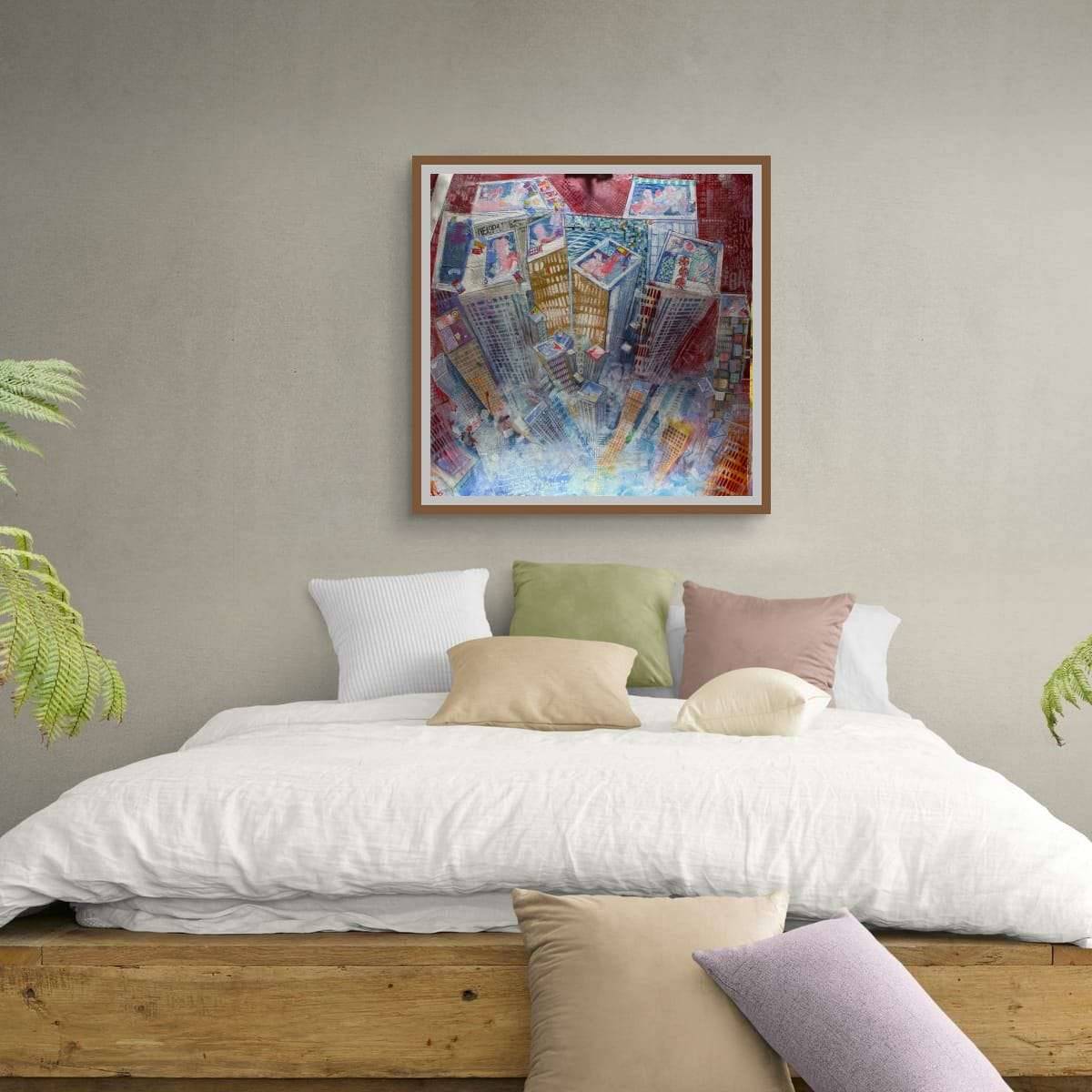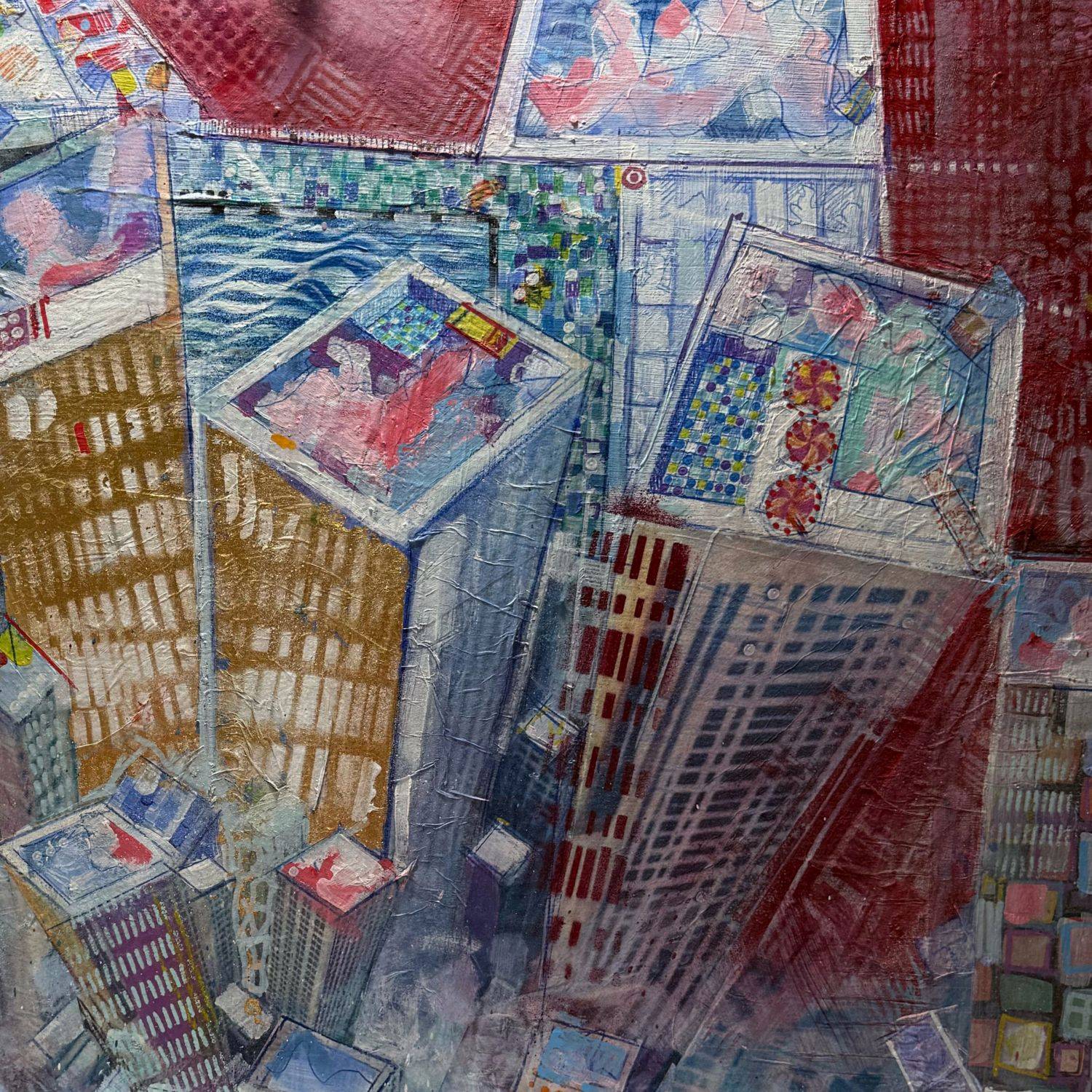 A vibrant mixed-media cityscape by Tim Willcox - an aerial reflection on privilege, beauty, and imbalance within the modern urban experience.