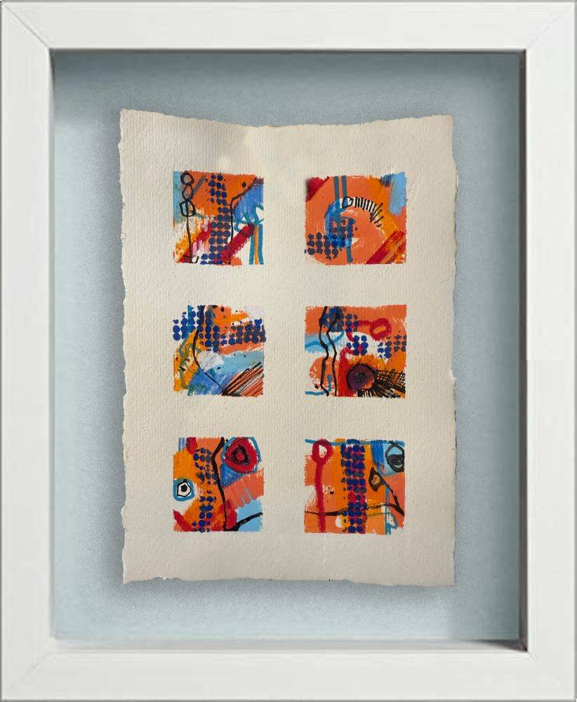 Small A5 Sketchbook studies into colour and texture using various mediums including marker pen, acrylic ink, stencil and spray, oil pastel and chalk pencils. Many of these works are lined with black dip pen Indian ink to define key shapes and to add structure.