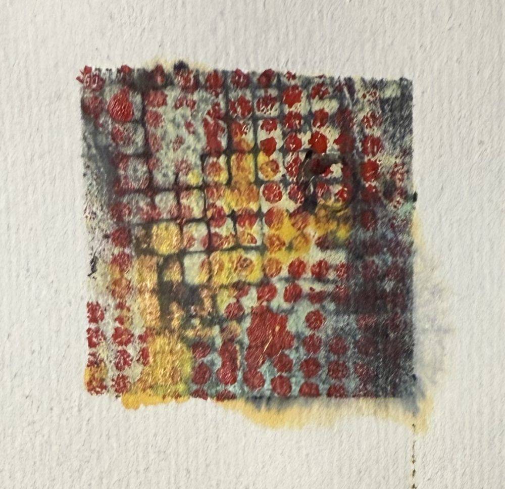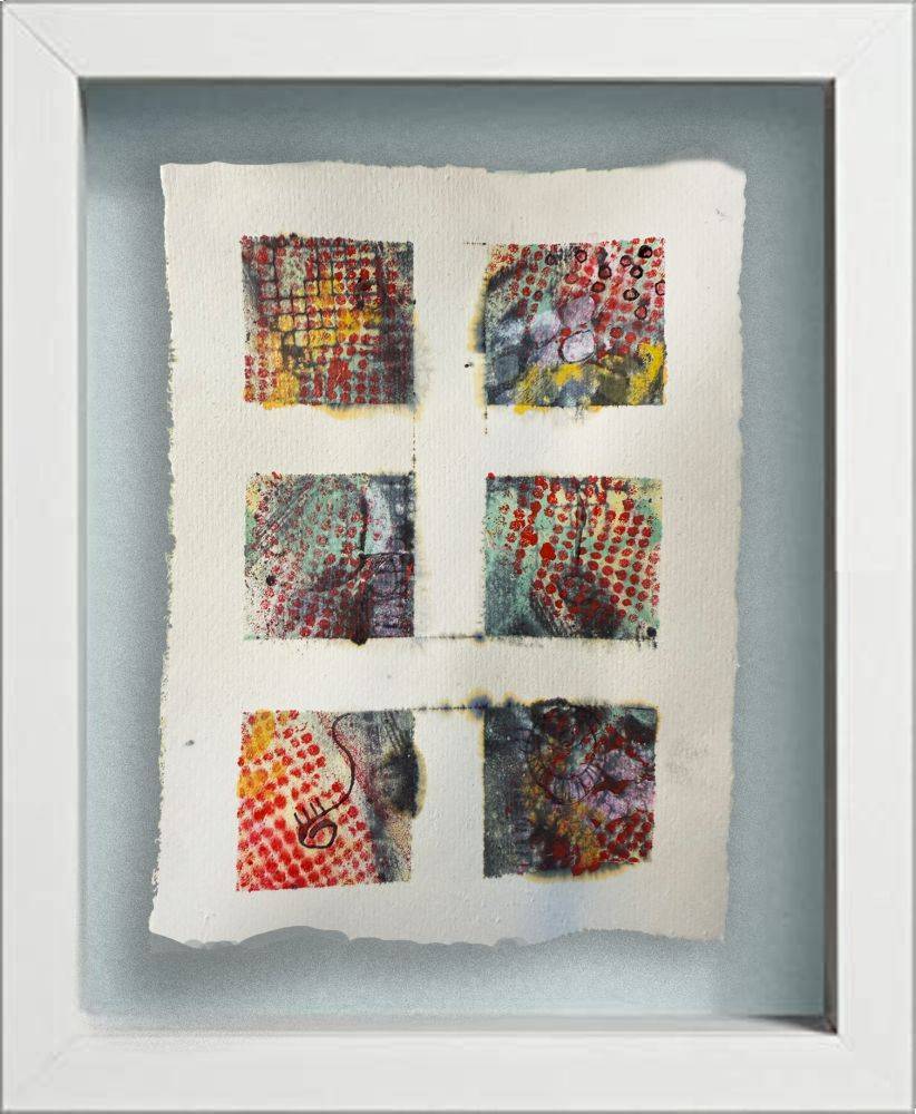 Small A5 Sketchbook studies into colour and texture using various mediums including marker pen, acrylic ink, stencil and spray, oil pastel and chalk pencils. Many of these works are lined with black dip pen Indian ink to define key shapes and to add structure.